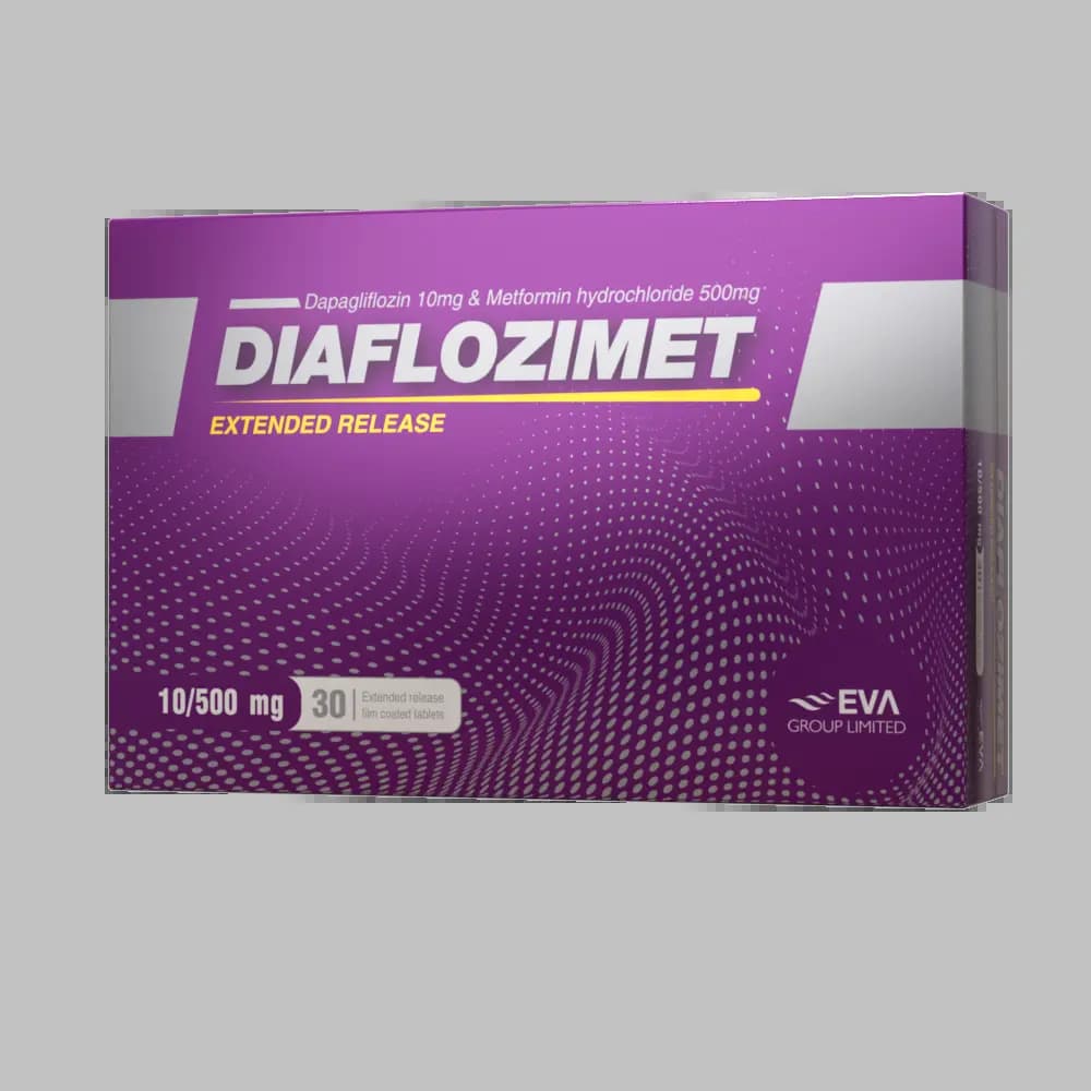 تركيبة متطورة للتحكم في سكر الدم لمرضى السكري من النوع الثاني. يحتوي كل قرص ممتد المفعول على مادتين فعالتين هما داباجليفلوزين بتركيز 10 مجم وميتفورمين هيدروكلوريد بتركيز 500 مجم. يعمل الدواء على تحسين استجابة الجسم للأنسولين وتقليل إنتاج الجلوكوز. يُستخدم ديافلوزيميت بالتزامن مع نظام غذائي ورياضي مناسب وتحت إشراف طبي.
